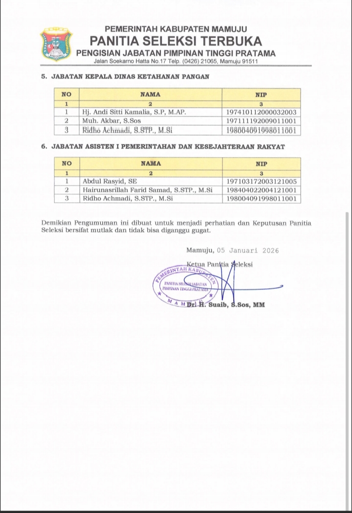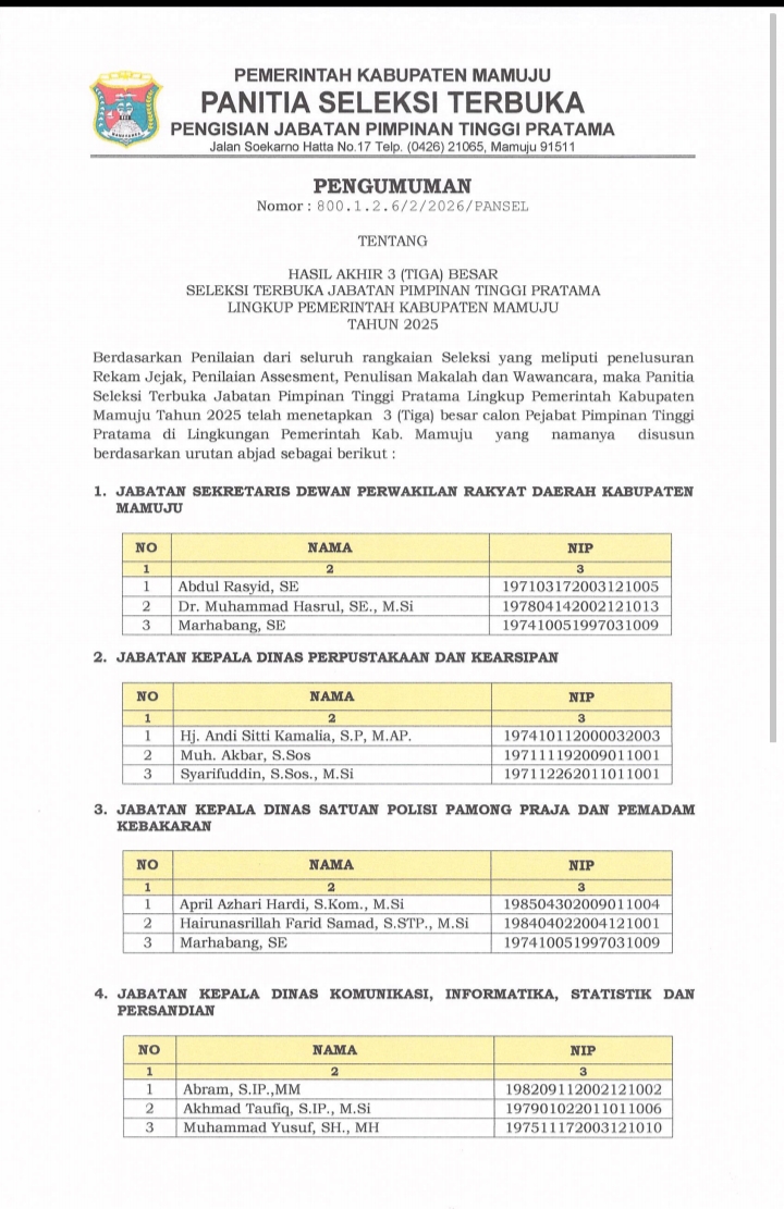 Tak Berkategori KIP Diskominfosandi6 Januari 2026 Hasil Akhir (3) Tiga Besar Seleksi Terbuka Jabatan Pimpinan Tinggi Pratama Lingkup Pemerintah Kabupaten Mamuju Tahun 2025 Oplus_131072 Oplus_131072