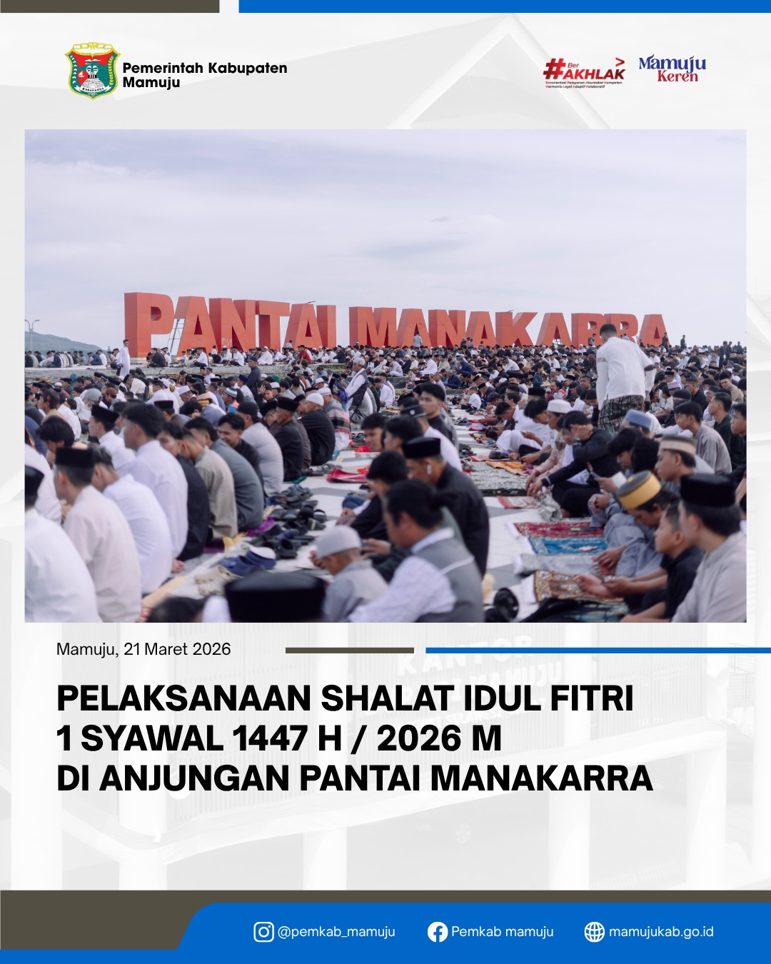 Shalat Ied yang dimulai sekitar Jam 07.00 WITA, di Hadiri oleh Gubernur Sulawesi Barat H. Suhardi Duka, Forkompinda Sulbar, Bupati Mamuju, Hj. Sitti Sutinah Suhardi, Wakil Bupati Mamuju, Yuki Permana, Sekdakab. Mamuju, H. Suaib, Forkopimda Mamuju dan Ribuan Masyarakat yang memadati Anjungan.
