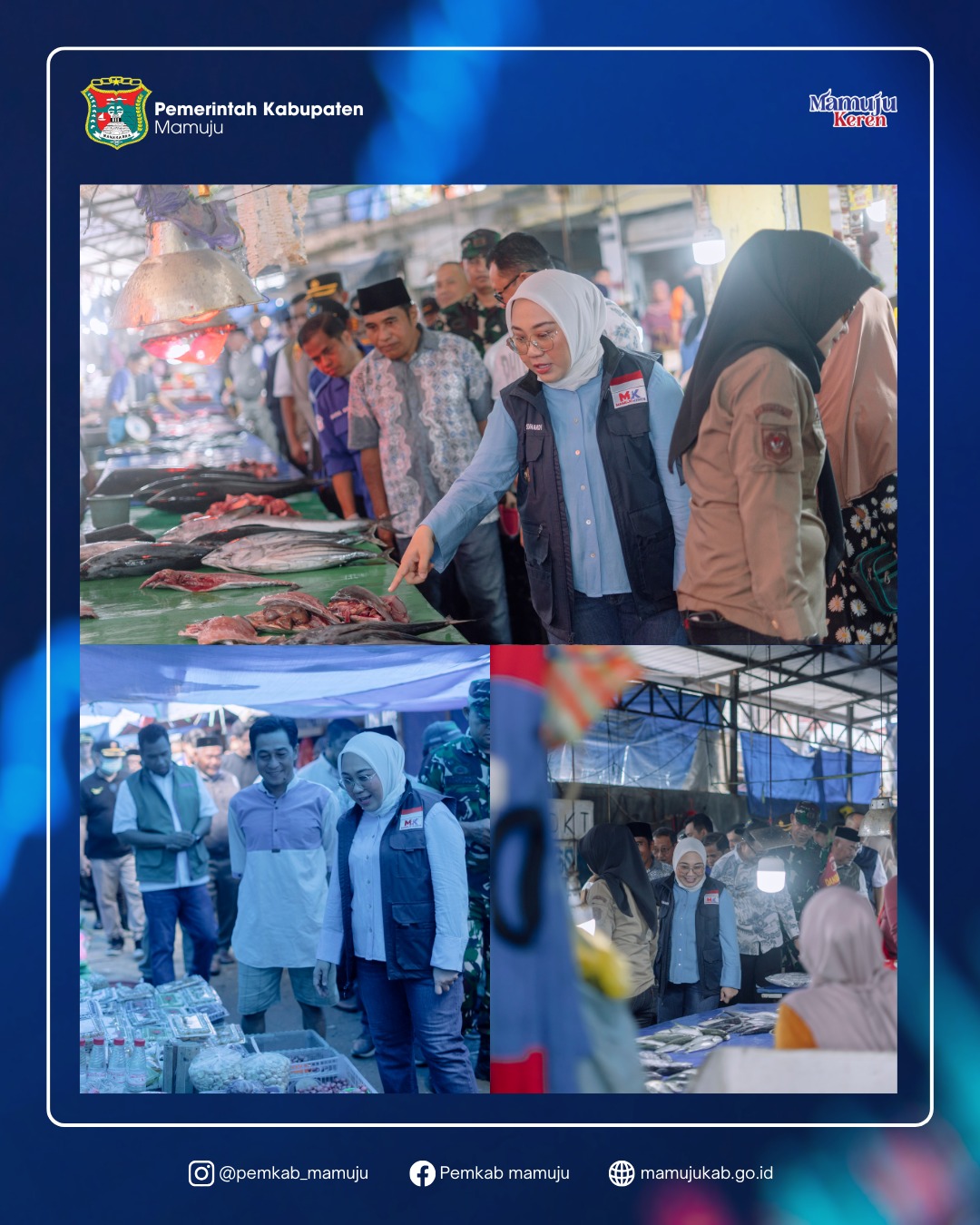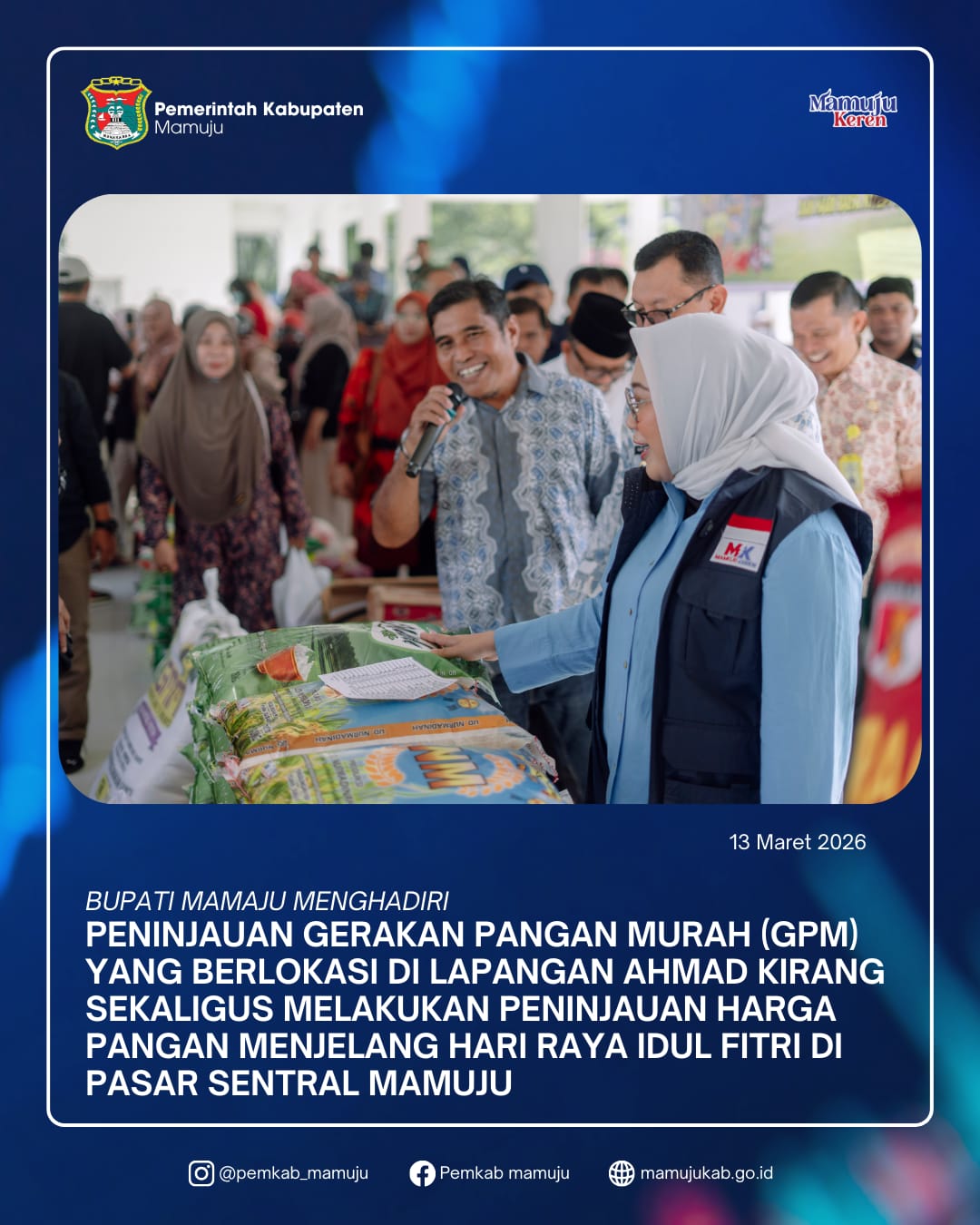 Bupati Mamuju, Dr. H. Sitti Sutinah Suhardi, SH., M.Si. didampingi Wakil Bupati Mamuju, Yuki Permana, ST. melakukan Peninjauan Gerakan Pangan Murah (GPM) 13 Maret 2026. Kegiatan yang dipusatkan di Tribun Lapangan Ahmad Kirang merupakan agenda rutin dari Tim Pengendalian Inflasi Daerah Kabupaten Mamuju untuk dapat menjaga stabilitas harga pangan, utamanya menjelang Hari raya Lebaran 1447 H. Kegiatan ini akan berlangsung selama dua hari dari tanggal 13 s/d 14 Maret 2026, merupakan kerjasama antara Pemerintah Kabupaten Mamuju, Pemerintah Provinsi Sulawesi Barat, BULOG, dan Bank Indonesia.